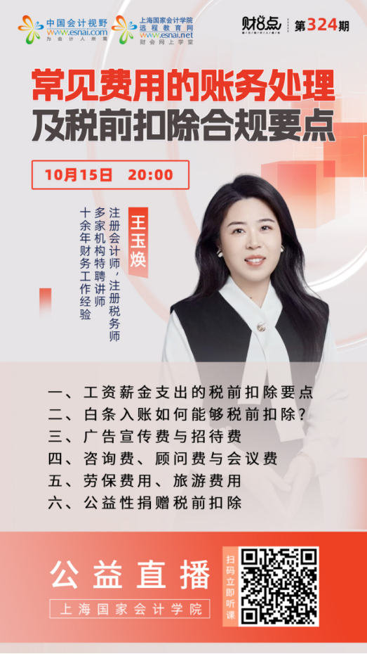 公益课堂直播:上海国家会计学院财八点 ——常见费用的账务处理及税前扣除合规要点